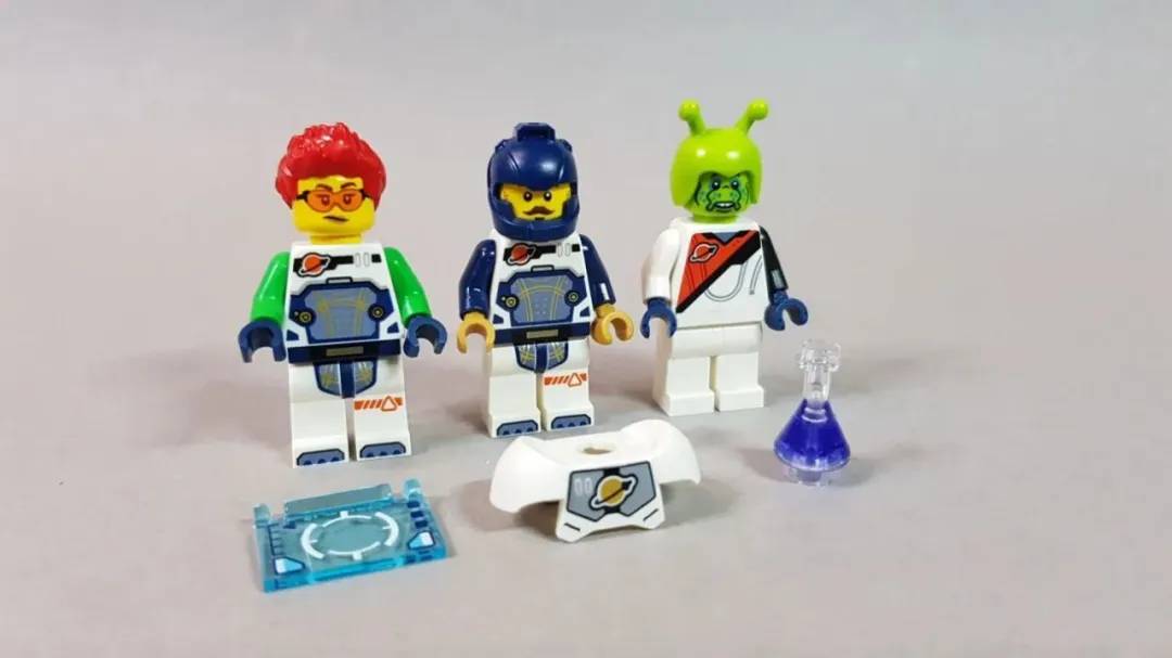 一方面,这里有绿色和蓝色的太空宇航员服装,就像乐高城市套装中的一样。但也有其他很特别的零件,因为在套装中没有第三个外星人的衣服,也没有外星人的表情印刷,这两个零件是全新的。另外蓝色宇航员的印刷盔甲也没出现在任何套装中。