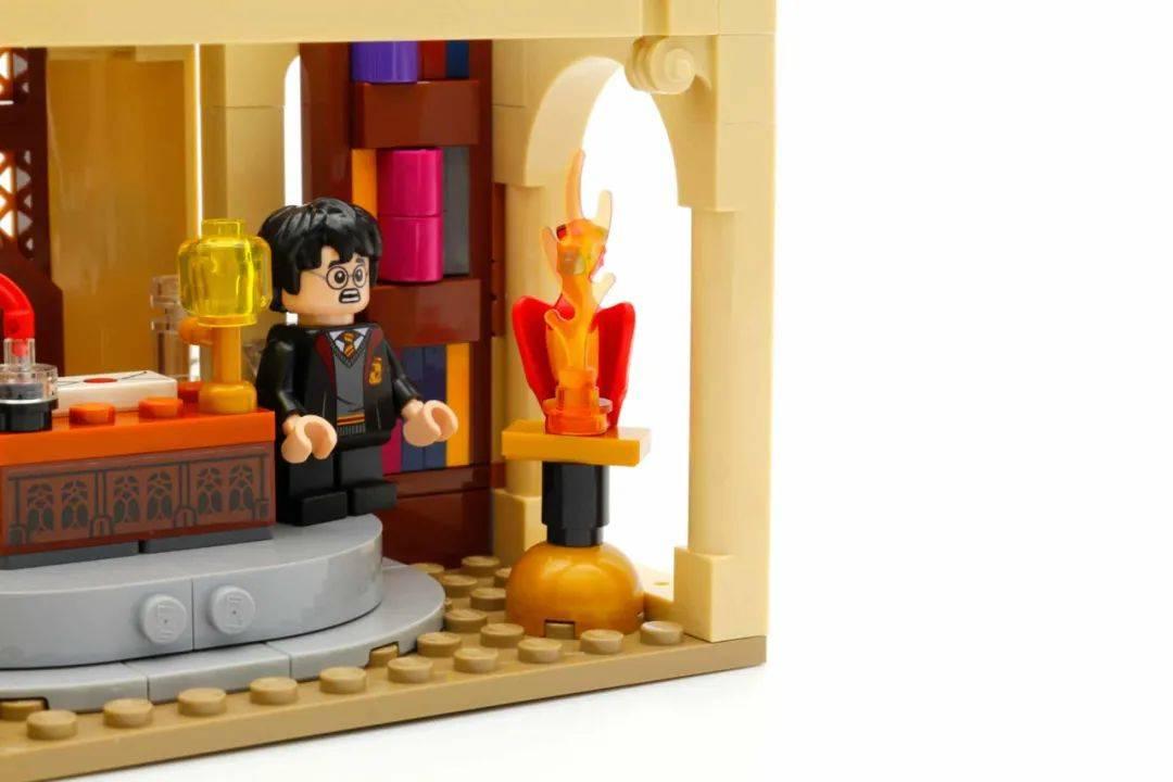 桌子两侧高大的书架旁边,分别摆放着分院帽和一只红色的小鸟,红色小鸟代表着刚刚复活的凤凰幼鸟,在电影中哈利波特第一次进入到邓布利多办公室,就目睹了凤凰从焚烧到复活的全过程。此处也给喜欢套内MOC的玩家埋下了一个伏笔,可以利用火焰效果和人仔抽抽乐中的凤凰零件,将凤凰焚烧的过程表现出来。
