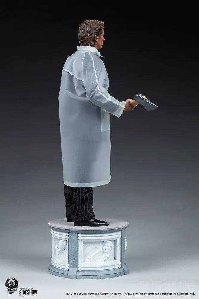 本作高约 22.5 寸(约 57 公分),整体是以“帕特里克·贝特曼”双手持握斧头的站姿为题设计,并身穿可以凸显其身份地位的名贵西装,眉头深锁的神情不仅传达出杀人冲动萌发的紧张感,西装与斧头的搭配更是有种衝突感,底座也十分有特色,可以看到帕特里克·贝特曼于剧中各种经典时刻的立体浮雕;在豪华(Deluxe)版当中则追加了那件他在准备砍死保罗·艾伦(Paul Allen)时套上的透明雨衣,以及一颗疯狂之气显露无遗的大笑头雕,血腥(Bloody)版本则是在头雕、雨衣上都做出了血迹斑斑的涂装,并附上了溅血样式的狂笑头雕。
