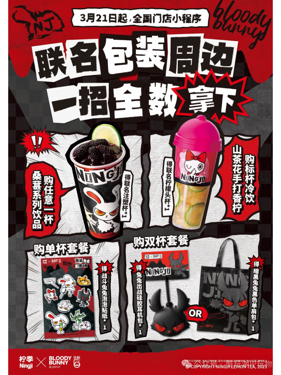 柠季与 BloodyBunny 的联名活动共有三种饮品套餐可选,参与活动的饮品有人气桑葚和新品山茶花两种系列,不同的套餐对应着包括联名泡泡贴纸、硅胶零钱包、黑色单肩包在内的不同周边产品,可根据个人喜好来选择下单。
