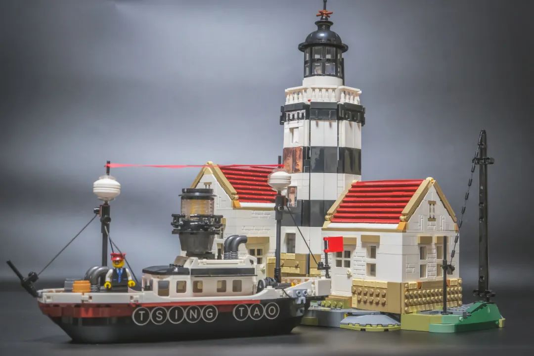 乐高粉丝设计师冰的《游内山团岛灯塔》作品非常别致。这组模型不仅包含团岛灯塔及其附属房屋,还有一艘牵引驳船和一座微型“团岛纪念馆”。纪念馆中巧妙地摆放着缩小版的同款灯塔和驳船,增添了作品的趣味和细节。