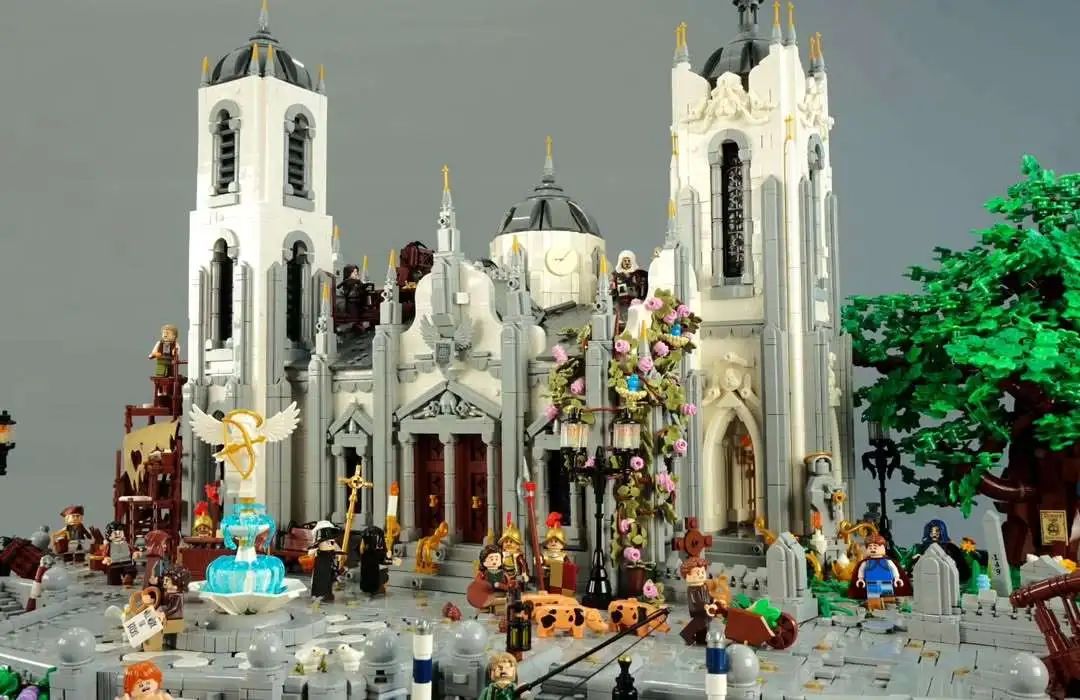 这款 MOC 作品以教堂为核心,周围环绕着石板铺就的广场、蜿蜒的小桥和静谧的蓝色水面。教堂的建筑充满文艺复兴时期的细节:拱门、尖顶和雕花装饰构成了复杂且精致的立面,再现了威尼斯的古老与优雅。