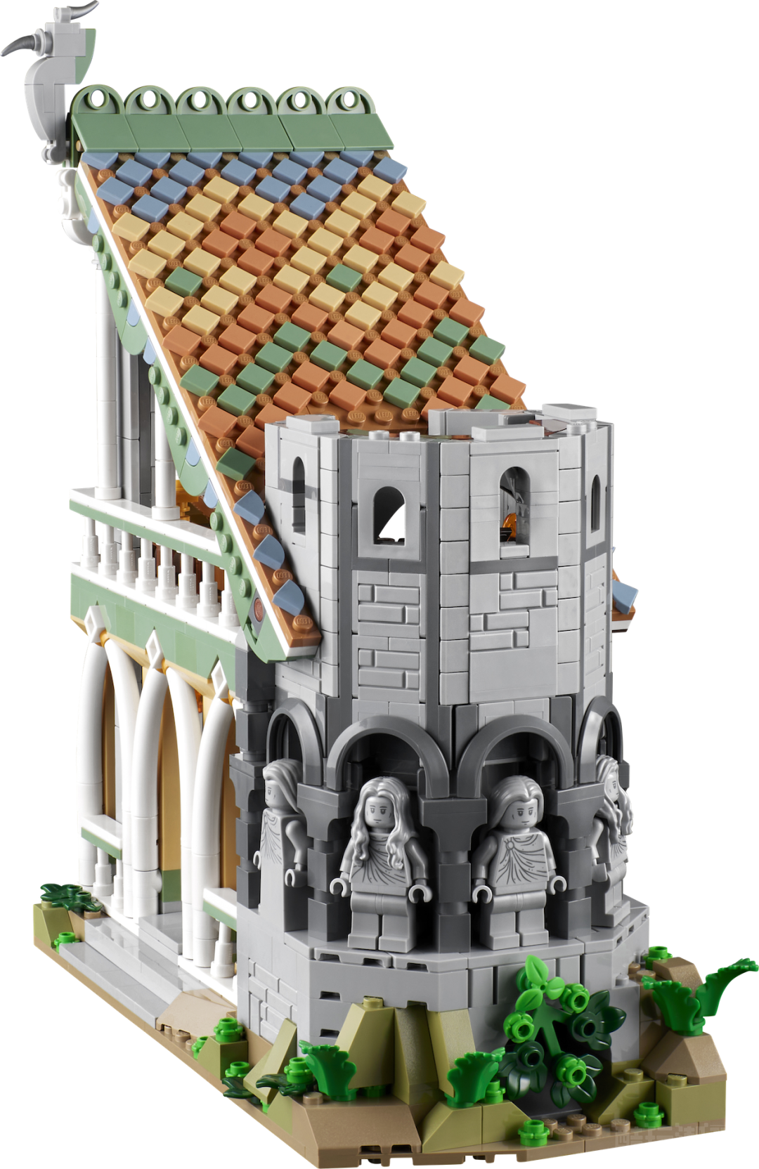 这款10316 幽谷瑞文戴尔由一座满是白色柱子和灰色塔楼的大型主楼组成。与电影中一样,屋顶是色彩柔的沙绿色,建筑的中央正好构成了埃尔隆德会议的背景。