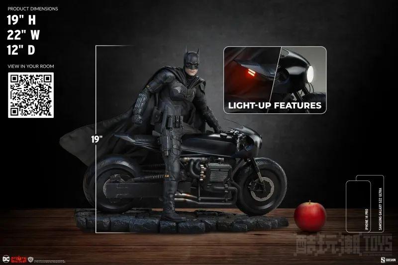 本作高约 48 公分,长度则来到 55.8 公分,展现出“蝙蝠侠”跨坐在蝙蝠机车上的帅气姿态,不管是准备停车前往调查、或是正要上车启程离去,这尊蝙蝠侠都能完美诠释;本体再现了派汀森版蝙蝠侠的各处造型细节、胸口蝙蝠标志、装备于全身的武器,以及戴上蝙蝠面罩的面部轮廓,布料披风则在内部设置铁线,可自由弯折出增添跃动氛围的样貌,蝙蝠机车也考究还原出细緻的机构、两颗巨大的轮胎、特色的车头……等,在车头、车尾部分还有安装 LED 发光功能,点亮之后更具临场感。