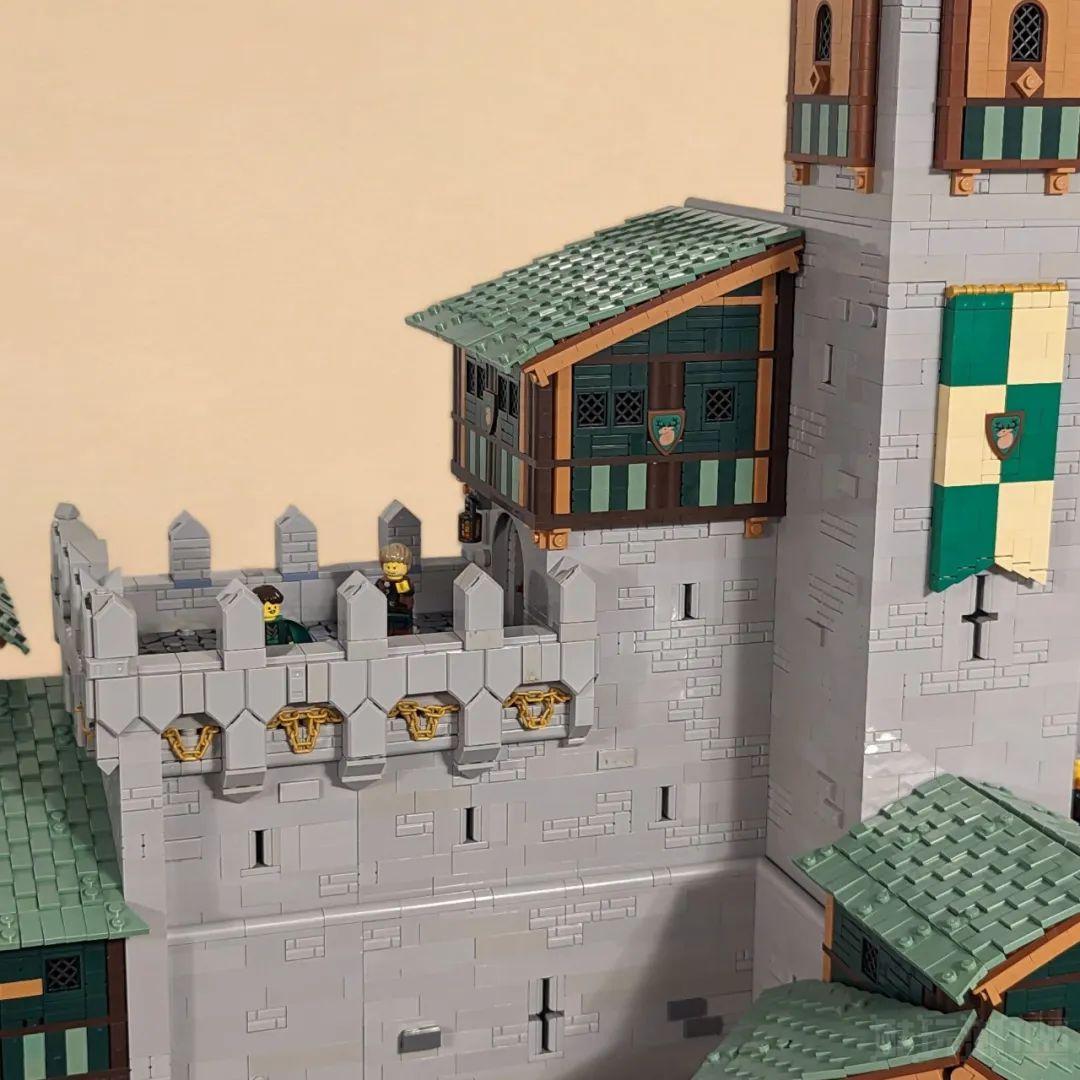 向左转,我们可以欣赏到一些石拱底部利用链条添加的金边。我们还可以欣赏到沙绿屋顶上的瓦片,这些瓦片是通过将 1×2 瓦片部分粘贴到板上而形成的。从这个角度看,最后一个值得一提的设计亮点是墙壁和横幅上的森林人标志(绿地上的麋鹿)。