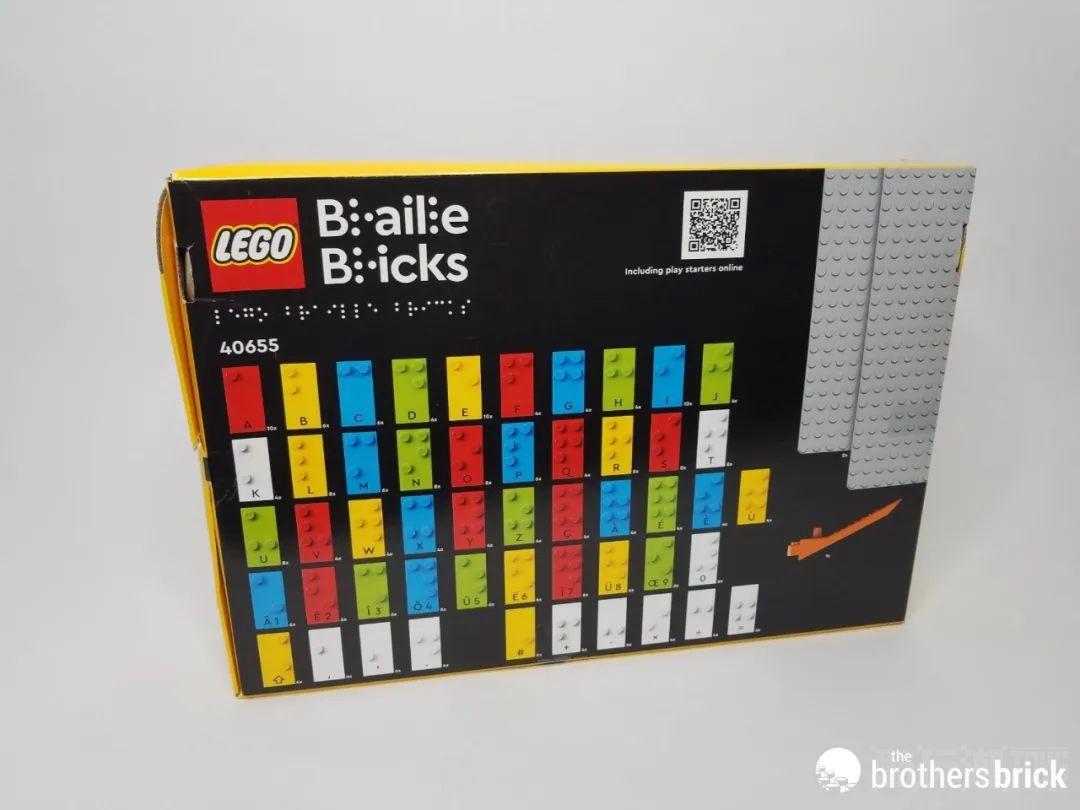 纸盒上充满了触觉图形,包括正面左上角的盲文名称。右上角有一个二维码,扫码即可访问乐高官网,了解该套装的产品和一些相关活动。把盒子翻过来,可以看到里面包含的零件都排列整齐了。和正面不同的是,盒子背面没有盲文指示。