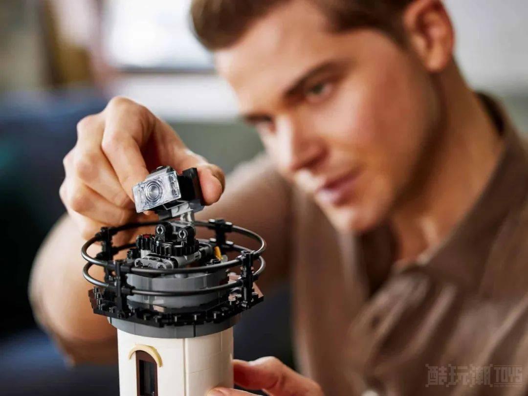 乐高灯塔的光源是一根带有两个LED发光砖块,和我们在霍格沃茨特快列车上看到的发光砖块差不多。据乐高公司称,专门为这套发光装置开发的透镜可以聚焦和旋转光线。玻璃圆柱体由乐高卷帘门零件巧妙地构建而成,电缆另一端的 LED 显然用于为附属建筑提供照明。