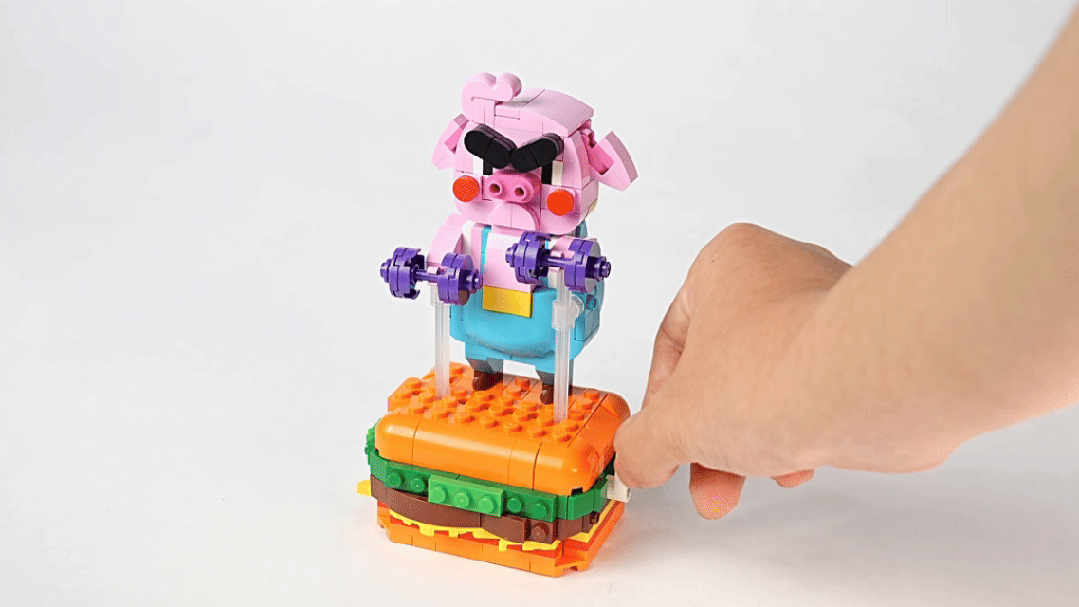 结构设计上,小猪采用立体造型还原,表情生动,四肢比例恰当,汉堡底座则以分层积木呈现出生菜、牛肉饼与芝士的层次感。