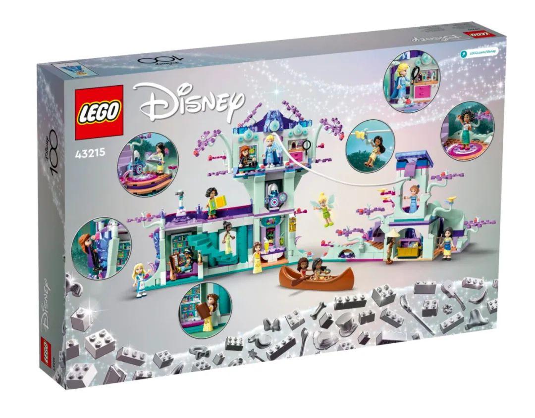 43215 魔法奇缘树屋这款套装有1016个零件,包含13个好朋友风格的公主人仔,官方售价为1599元。组装完成的模型长36cm,宽13cm,高25cm。