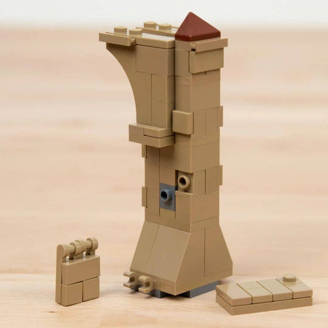 在塔中,Jonas使用了一个车辆零件(24151),它最初用于小型超级英雄汽车——Mighty Micros。放轮胎的两个半圆形切口构成了两个小拱门,它们相互紧挨着。之后的挑战是在侧面建造薄墙壁,Jonas用普通的1×2板边缘来解决了这个问题。