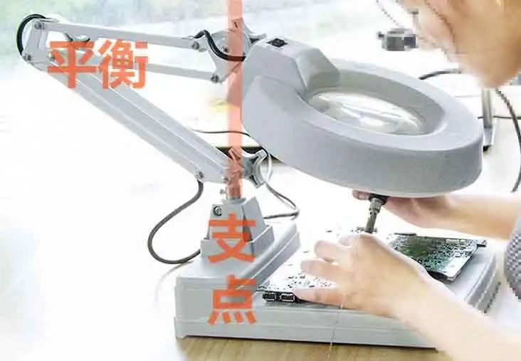 传统的放大镜灯为保持平衡,必须把手臂移到支点的另一边。这是浪费空间的设计。