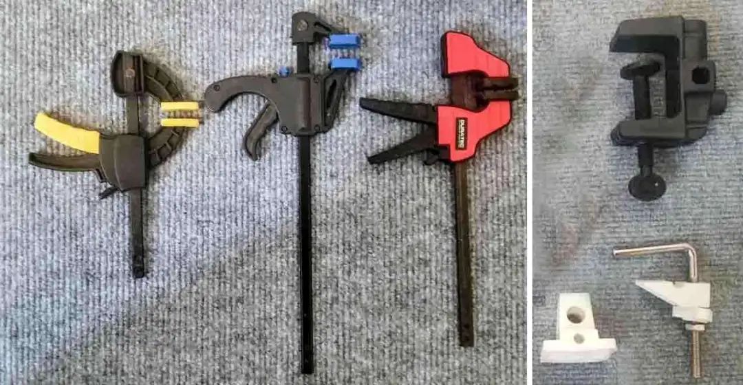 这种 F 夹也叫快速夹,有大有小,在木工店便宜到像是不要钱一样。颜色也不难看。因为是专门的木工工具,夹紧了几乎不可能松。