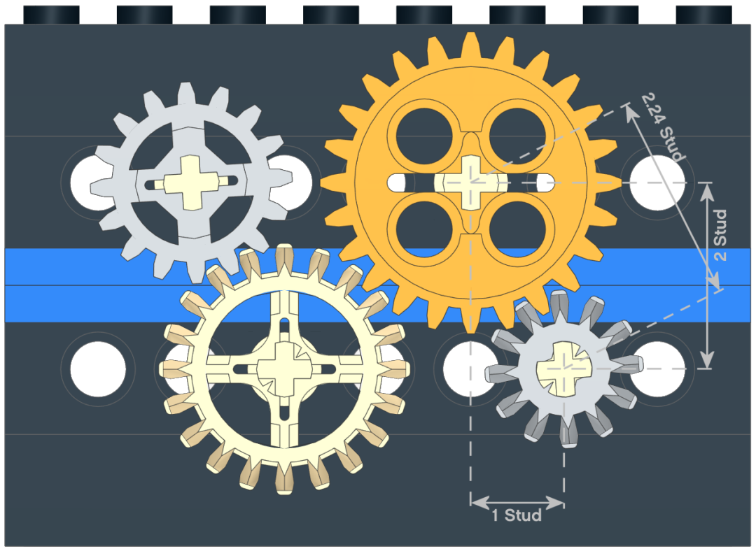 如果两个齿轮在水平上差 2 螺柱,垂直上差 1 螺柱,根据勾股定理,它们之间的距离就是 √5 ≈ 2.236 颗粒——刚好够一些“跨家族”齿轮配对使用!