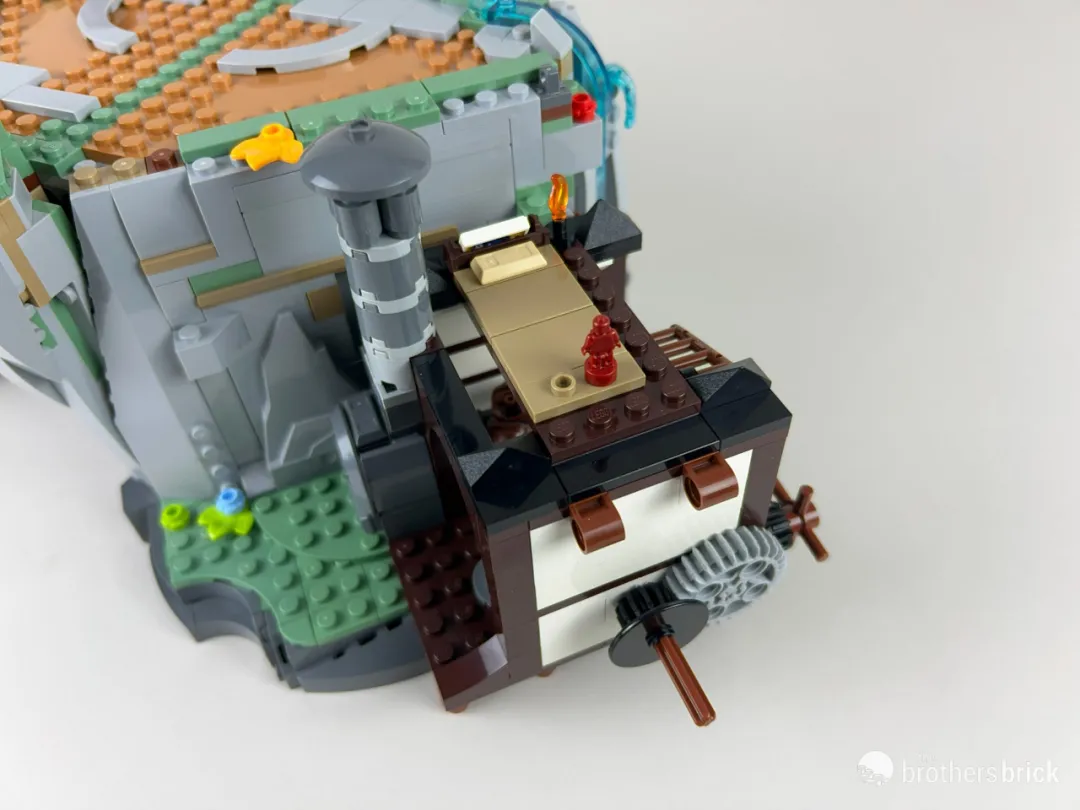 这个模块的顶部是一块巨大的中肉色三角板,上面搭建了一些流水效果,流向下游的水车。在我们开始建造神庙城底座的中心模块之前,在这个底座的外侧还需要安装一些灰色楔形零件来表现岩石效果。