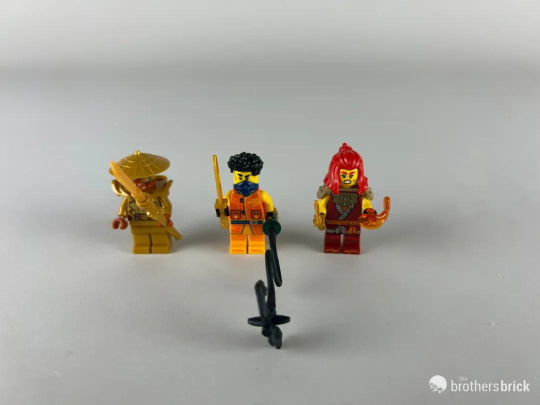 接下来是神庙守卫、阿林和热元素大师Wyldfyre的人仔。阿林手里拿着橡胶材质的攀爬鞭,Wyldfyre拿着一把短刀和可以弹射出去的火焰特效零件,神庙守卫则拿着一支长矛。