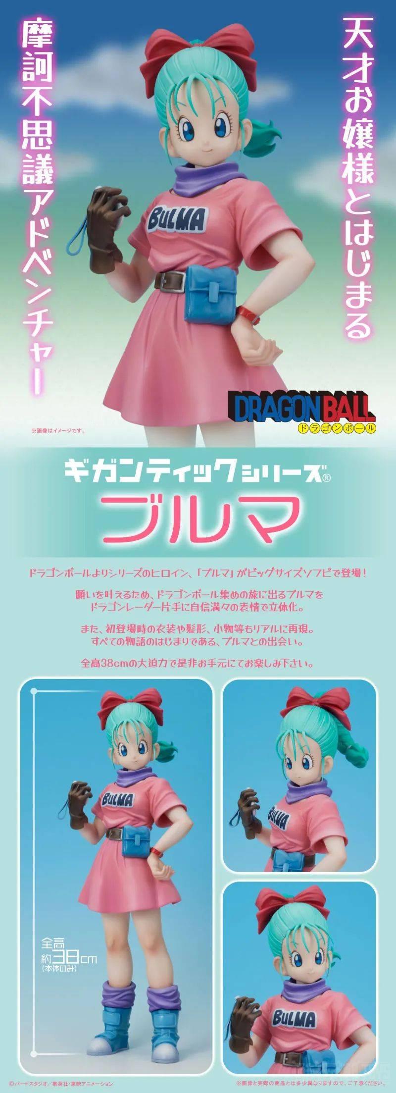 “Gigantic Series 布马”,以全高约 38 公分的大魄力尺寸呈现,以最早期还在寻找龙珠、与悟空一起大冒险的造型为基础,还原手拿着龙珠雷达、身穿特徵的粉红色连身裙的少女布马~怀念的大蝴蝶结与辫子发型,自信的表情可爱又充满青春魅力!