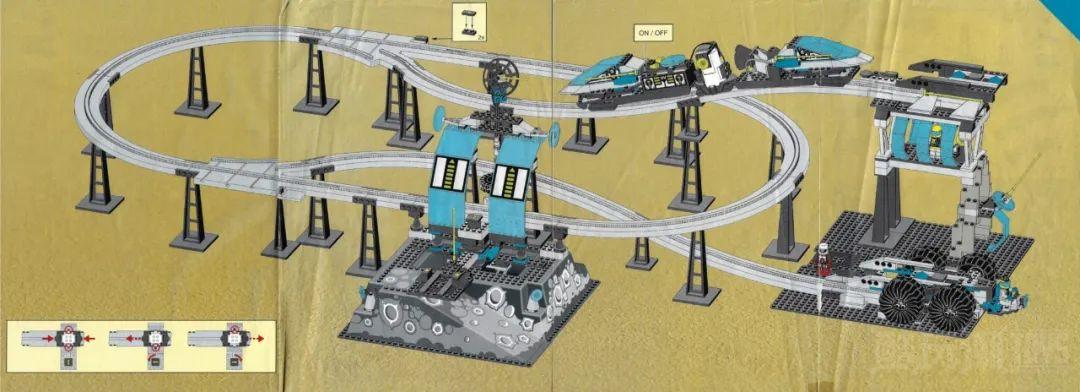 最后阶段,这套套装的所有零件都和剩下的轨道、开关相连,因为组装完成的单轨穿梭发射器尺寸真的非常大(长128cm),最后的步骤展示两页说明书都不够,下图是四页说明书完全展开的效果图。