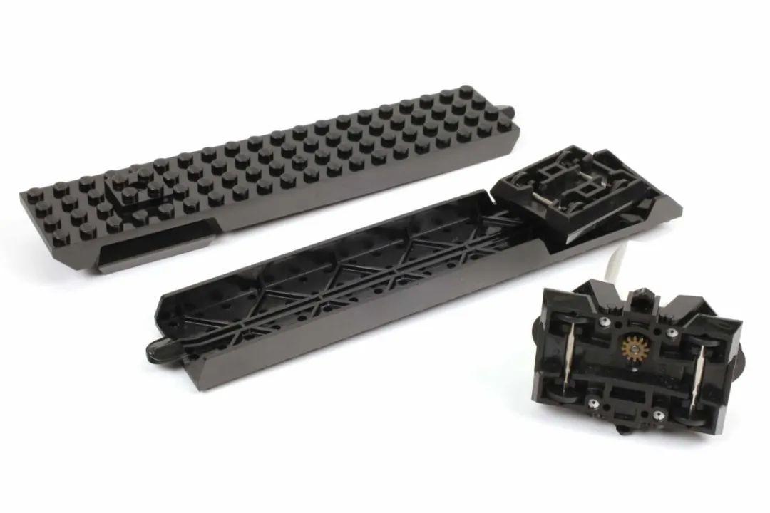 而且,它的轨道既是转向装置又是推进装置,因为它被设计成一个齿条,驱动装置的马达齿轮与之啮合,这种齿轮传动让单轨穿梭发射站成为乐高发射站系列中唯一一个能够通过陡峭坡度的套装。这就是它的转向架为什么必须是可转向的、可倾斜的,就像驱动装置和底盘两个部分之间的连接一样。
