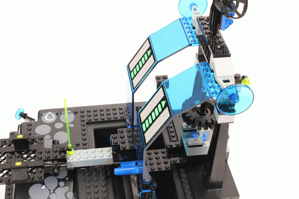 整个控制中心是在支撑物和底座岩石上的,间谍机器人在这里建立一个藏身之所,藏身之所里面的2×2斜坡转上印刷着一个Skype视频通话框,间谍机器人正在和Spyrius亲信联系,另外的1×2斜面砖上还显示着时间。斜坡砖的上方还有一个深蓝色透明的4×4天线雷达,天线也采用了霓虹绿。