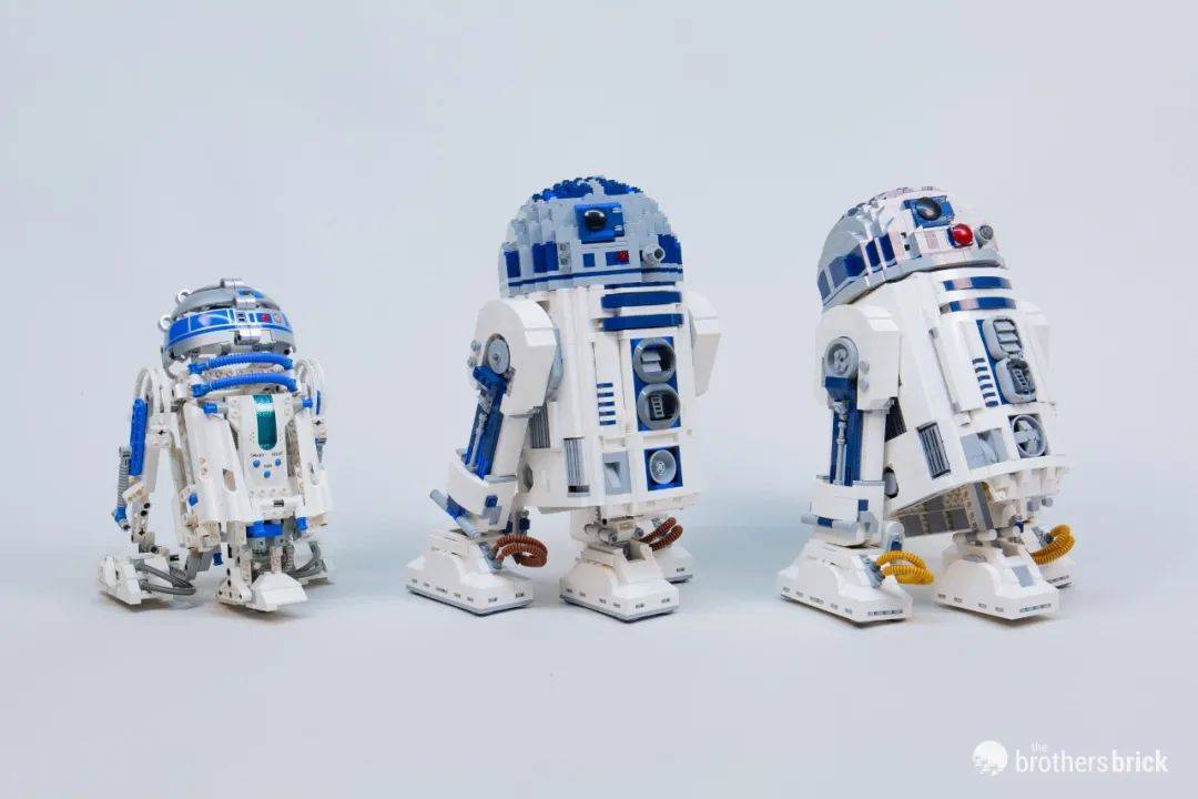 做为展示品,这是新的乐高星球大战R2-D2与其它大型乐高星战人物摆在一起的样子,包括75187 BB-8(2017年发布)和75318 The Child(2020年发布),虽然它们的比例各不相同。