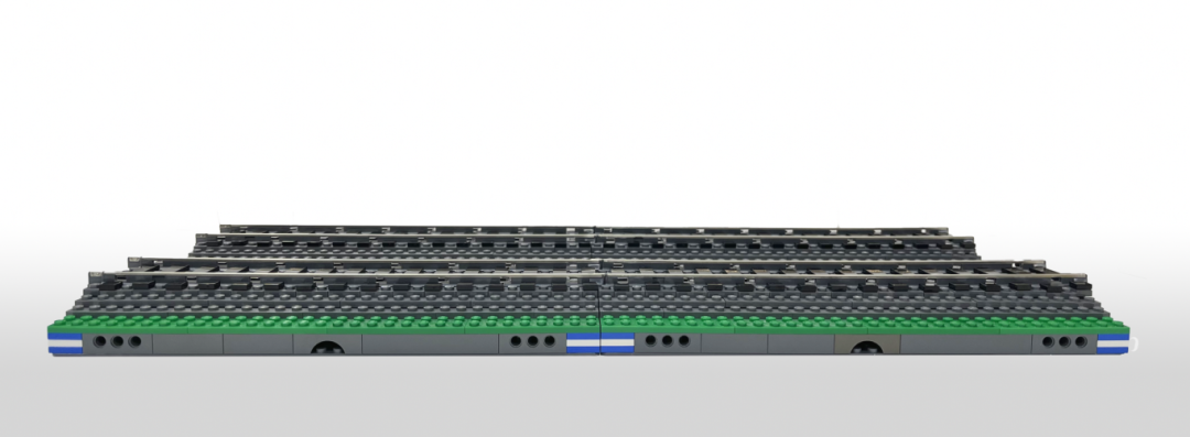 当我仔细观察轨道接缝处的轨道床轮廓时,我想到了一种新的设计方式:轨道轮廓不必完全沿着安装轨道的MILS模块的形状走,而是直接穿过接缝,将轨道床高度降至接缝下方,从而柔化了轨道的过渡部分。下图便是这一想法的示意。