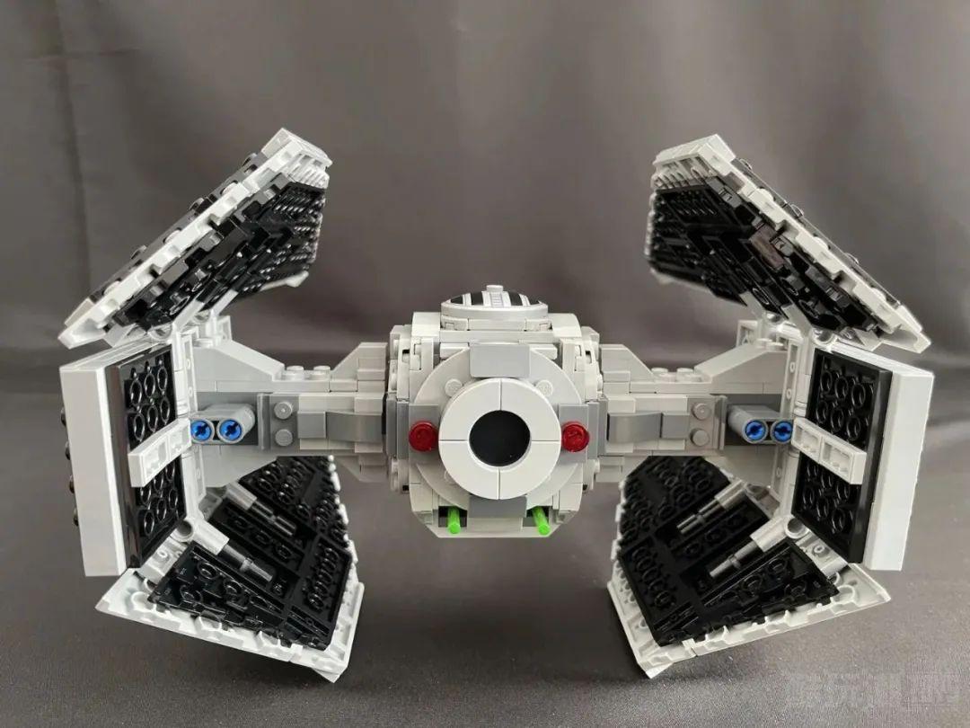 还有就是TIE 拦截机背面用来当做引擎的红色小颗粒、绿色的弹簧枪和外露的蓝色机械组插销给这架飞船增加了许多彩色的细节点缀,另外战斗机的后部看起来有点过于拥挤,这些都不符合我的口味。