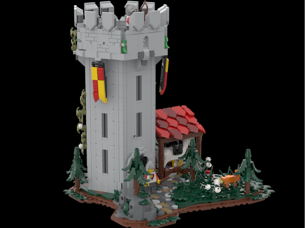 整套作品由 1891 块积木搭建而成,以中世纪城堡风格为主,藏身林间却又不失守卫之气。塔旁是一座带棚马厩,屋顶设计灵感来自乐高经典的 21325 中世纪铁匠铺与一款超赞的 Medieval Tavern MOC,既有结构美感,也有浓浓的生活气息。